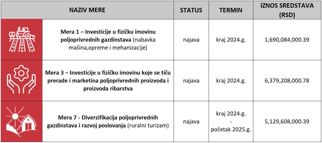 Do kraja 2024. godine je planirano raspisivanje još 2 poziva i to za Meru 3 – Investicije u fizičku imovinu koje se tiču prerade i marketinga poljoprivrednih proizvoda i proizvoda ribarstva sa ukupno predviđenim budžetom od 6,379,208,000.78 dinara i poziv za Meru 1 - Investicije u fizičku imovinu poljoprivrednih gazdinstava (nabavka mašina,opreme i mehanizacije) sa ukupno predviđenim budžetom od 1,690,084,000.39 dinara.